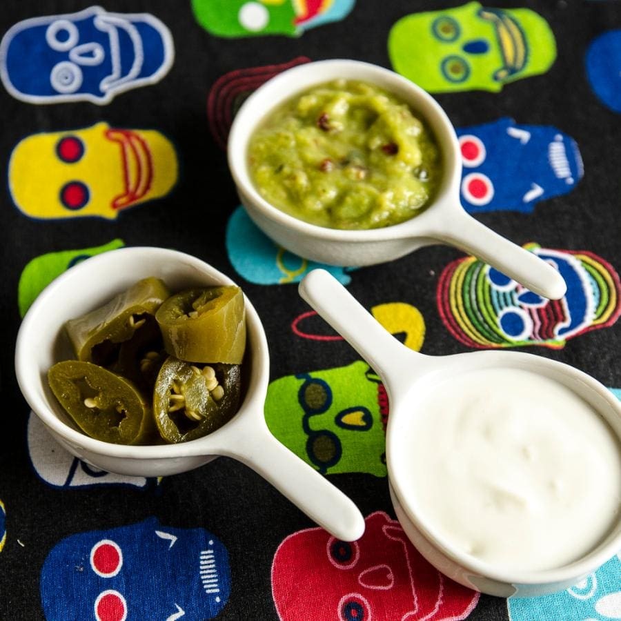 Porção de chips de milho crocantes acompanhados de chili beans, guacamole fresquinho, cheddar cremoso e sour cream. Tudo separadinho pra você mergulhar cada chip no sabor que quiser!