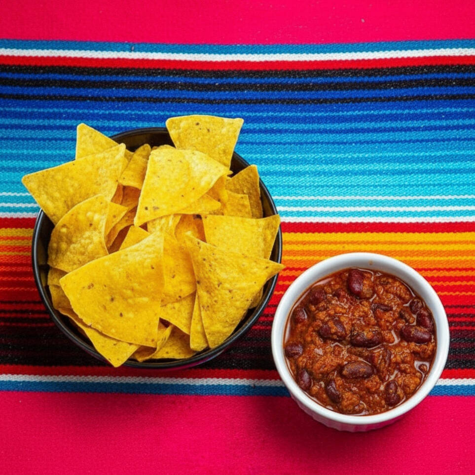 Carne com feijões vermelhos em molho de tomate picante. Acompanha chips crocantes de milho.