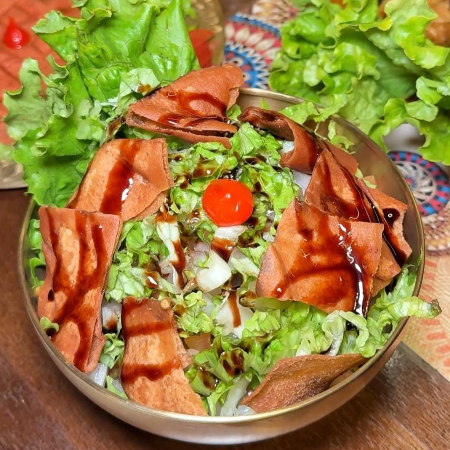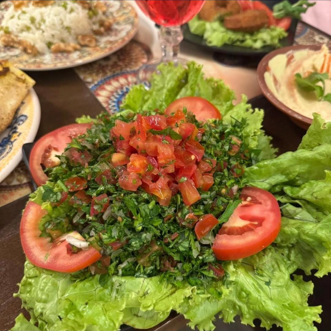Salada fresca de , Alface,Tomate,Azeite,Vinagre,azeitona ,pão sírio frito e o delicioso molho de romã