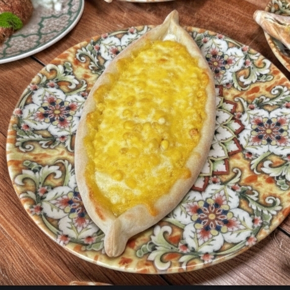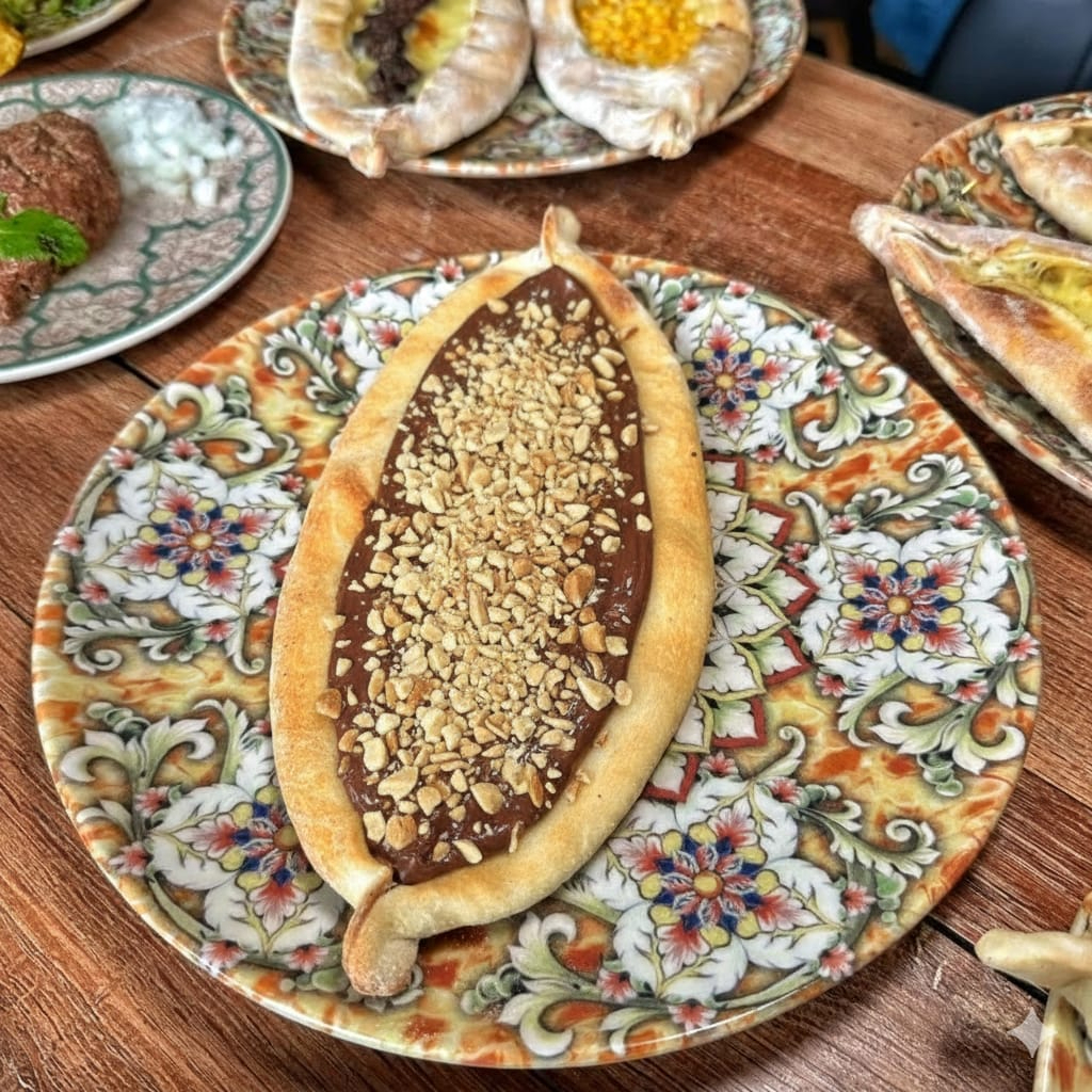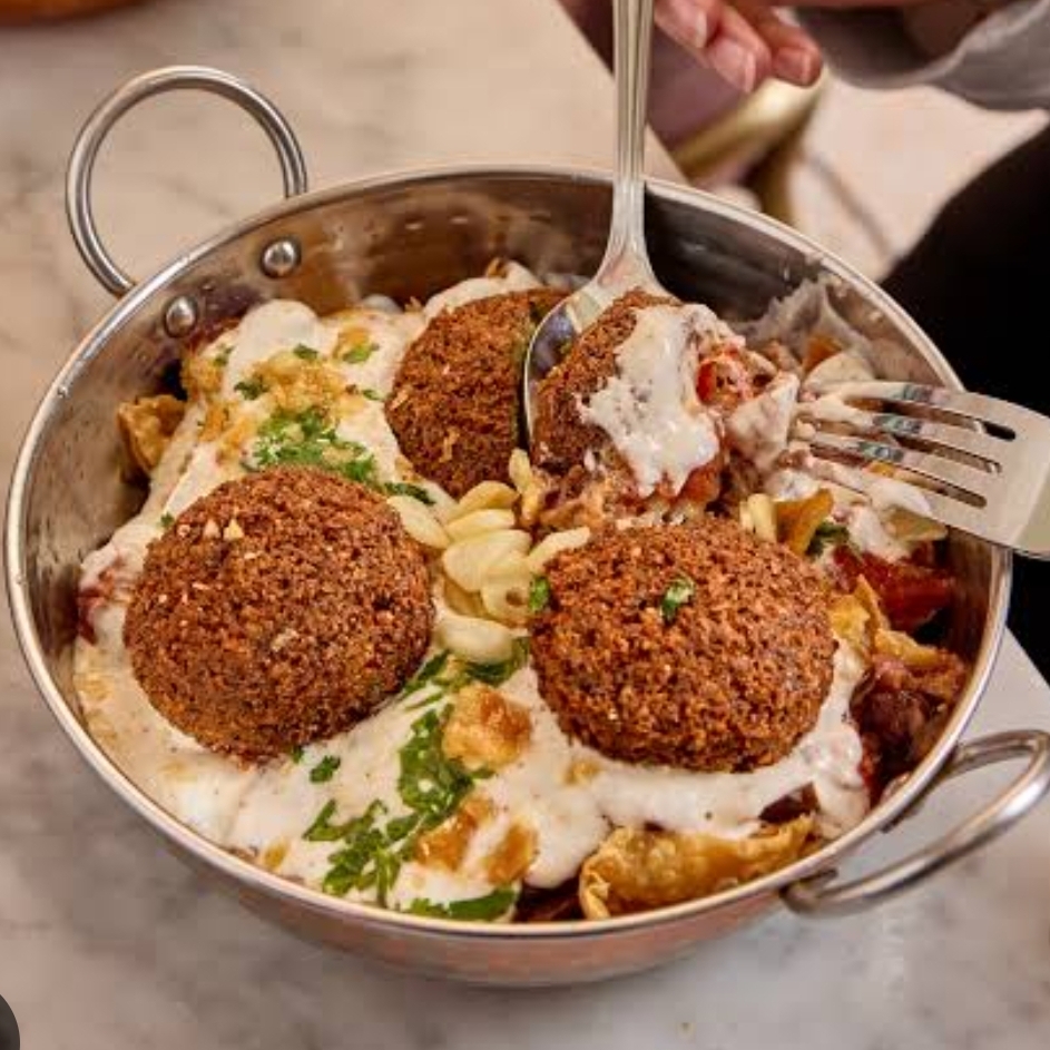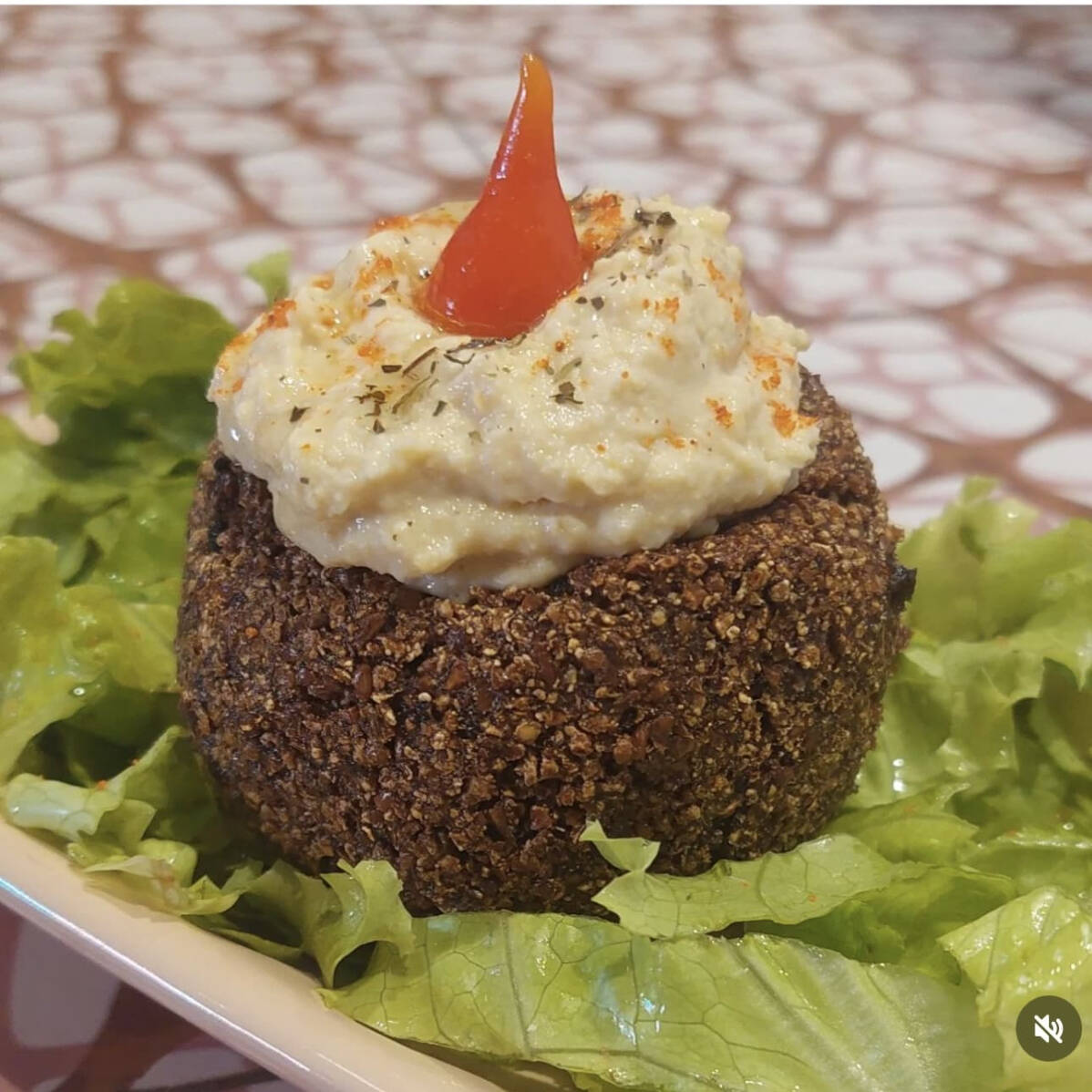 pão sirio torrado com molho de tahina temperado e pedaços e falafel , é uma explosão de sabor , peça o seu!