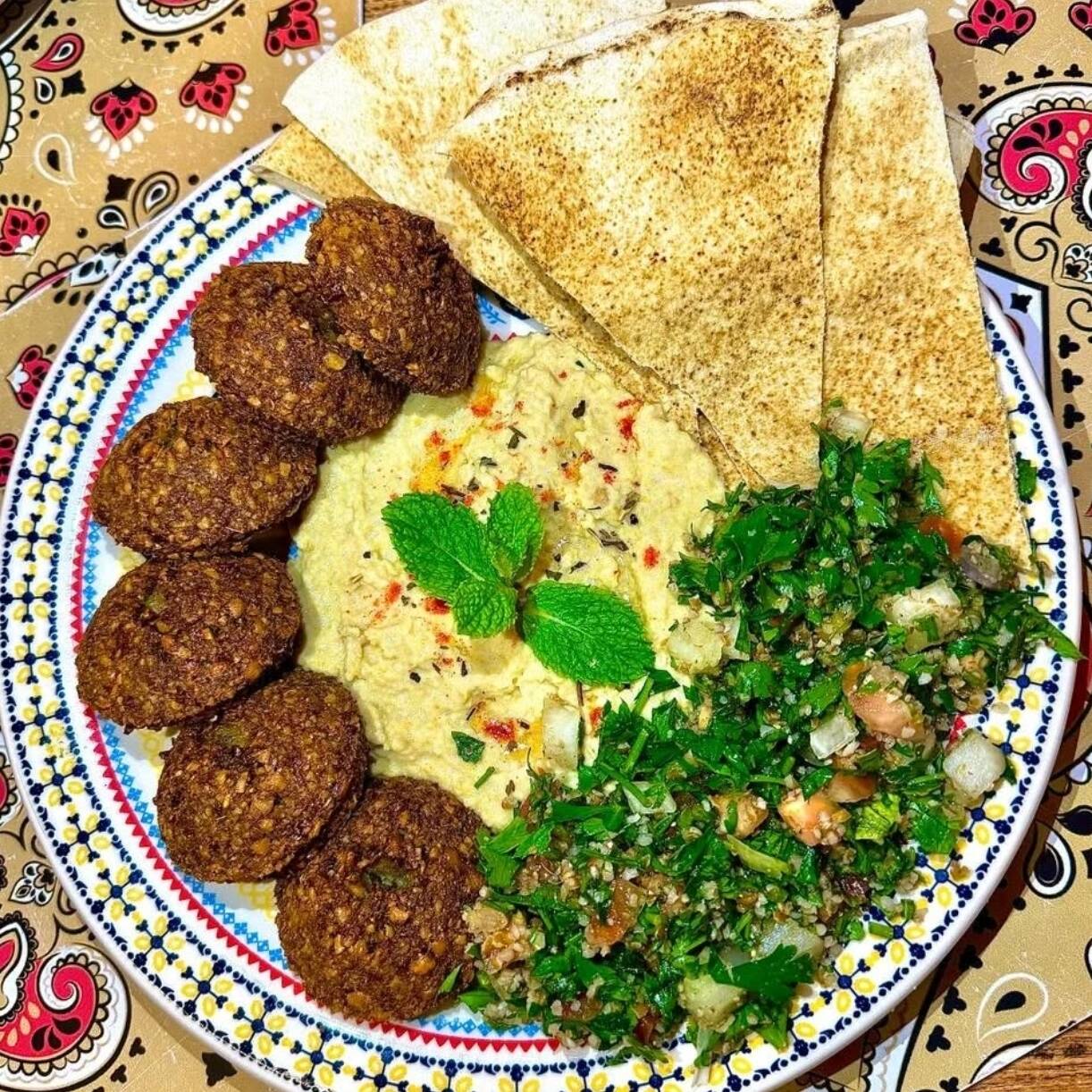 Delicie-se com seis bolinhos de grão de bico acompanhados de homus, pão sírio fresco e uma salada fresca. Pede agora!