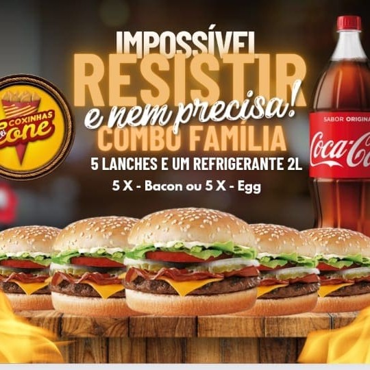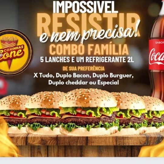 5 Lanches + Refrigerante 2 L!!! Sendo eles: X Tudo Duplo Bacon Duplo Cheddar Duplo Burguer Especial Aqui você escolhe!