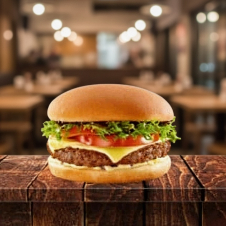 Pão, 1 hambúrguer, molho especial, queijo, alface americano, tomate