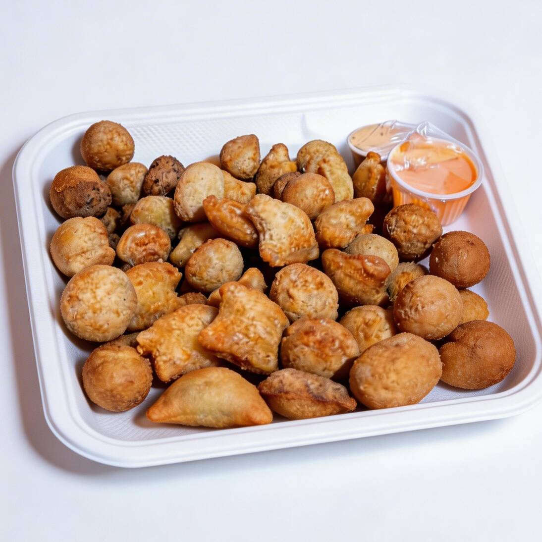 Contém 50 unidades. Os salgados são de 10g e temos: coxinha, risole, bolinho de queijo, calabresa com queijo e croquete.