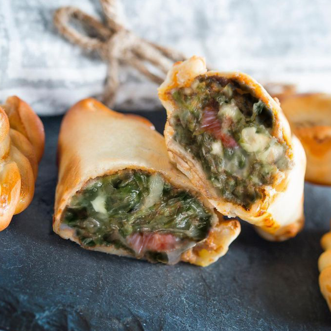 Empanada de palmito, cebola, tomate, ervilha, azeitona e ovo.