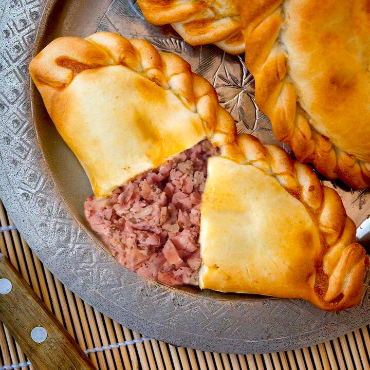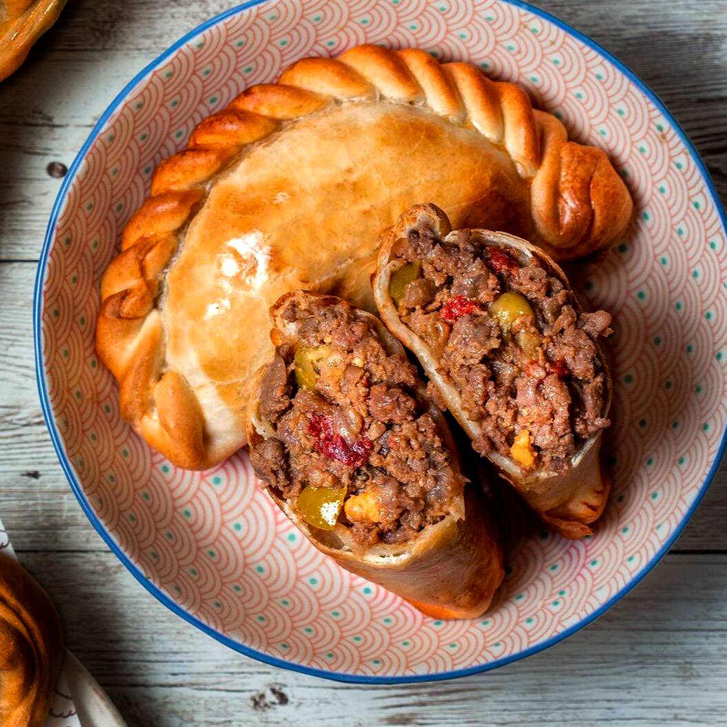 Empanada de carne com típicos temperos argentinos, cebola, azeitona-verde, ovo cozido e cebolinha.