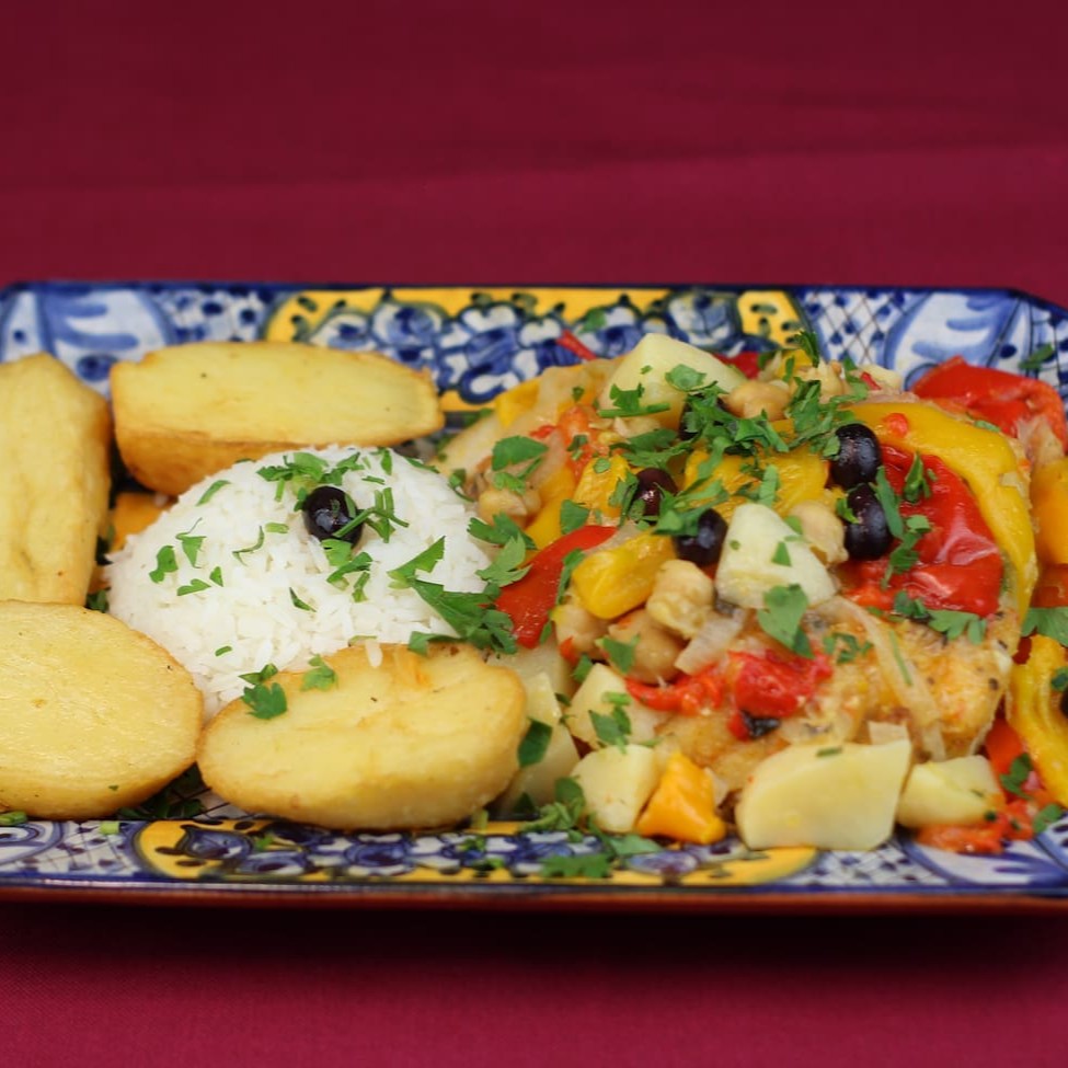 Posta de Bacalhau cozida e refogada no molho de azeite com pimentões, tomate, grão de bico e batatas em cubos.