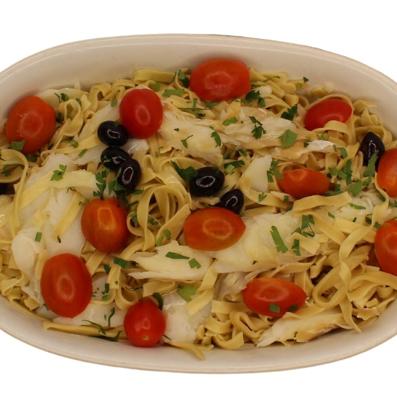 Esta deliciosa massa do tipo talharim é cuidadosamente refogada no mais puro azeite, e enriquecida com suculentas lascas de bacalhau. O prato ainda traz o sabor marcante do alho e da cebola, complementados pela doçura do tomate cereja. Para torná-lo ainda mais apetitoso, é decorado com a fresca salsinha e encantadoras azeitonas portuguesas, que juntas, criam uma harmonia perfeita para um almoço ou
