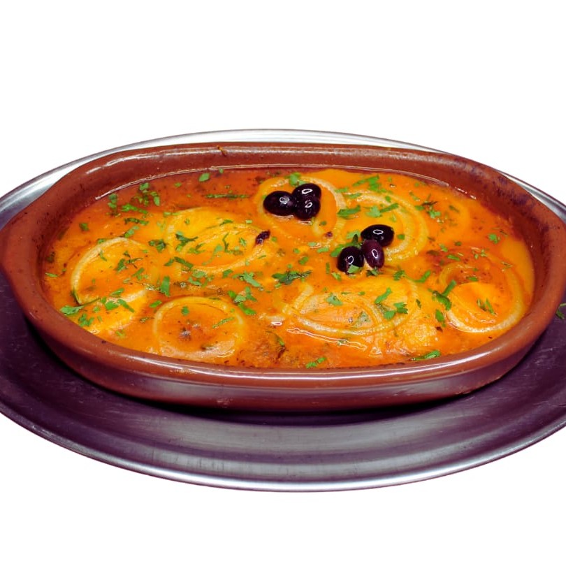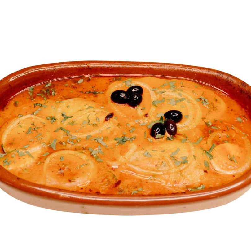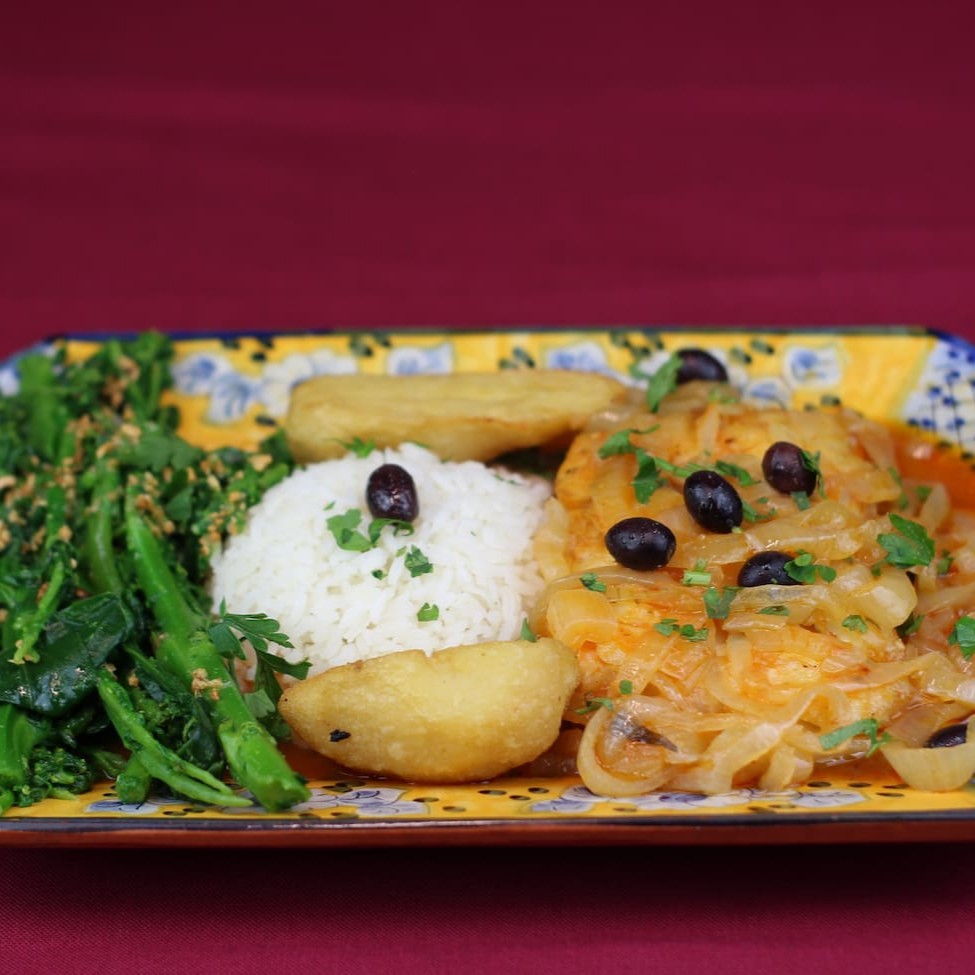Posta de Bacalhau, batatas e cebolas cozidas no leite de coco com um toque de páprica picante. Decorado com salsinha e azeitonas pretas.