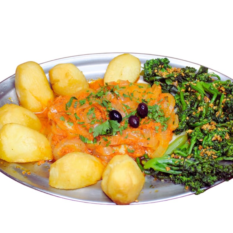Este prato individual apresenta uma generosa posta de bacalhau, grelhada à perfeição, envolvida em um molho rico e robusto de pimentão vermelho moído e cebolas caramelizadas. Acompanha batatas douradas 'à dorê', crocantes por fora e macias por dentro, brócolis refogados em azeite de oliva extra virgem, e um arroz branco soltinho. Uma combinação que exalta o sabor do mar e celebra a tradicional cul