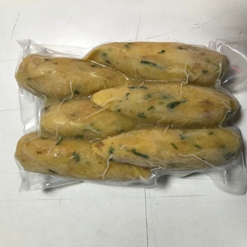 Enchido típico português à base de pão, carne suína e alho, mais dois acompanhamentos (opções: bolinho de bacalhau, ovo cozido ou frito, batata à dorê, arroz branco e brócolis).