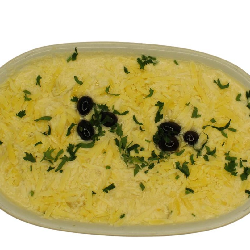 Posta de Bacalhau cozida com molho á base de manteiga, cebolas e alcaparras flambadas no conhaque, coberto com purê de batatas, gratinado com queijo parmesão ralado.