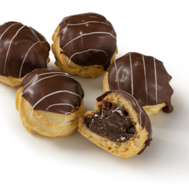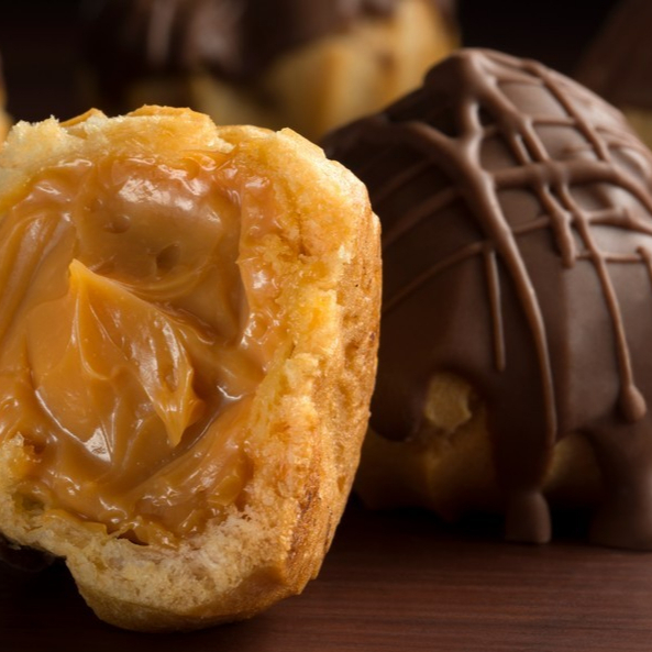 Carolinas recheadas com doce de leite com cobertura de ganache de chocolate ao leite.