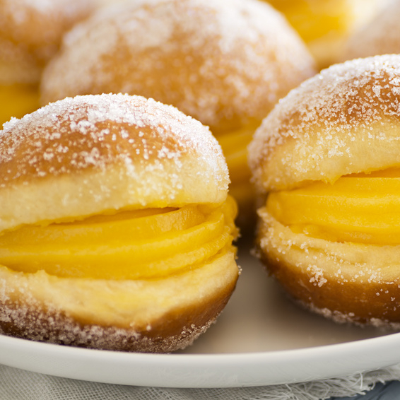 Sonho recheado com creme de confeiteiro com açúcar gelado polvilhado