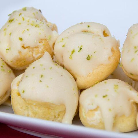 carolinas com recheio de mousse de limão com cobertura de ganache de chocolate branco com raspa de limão