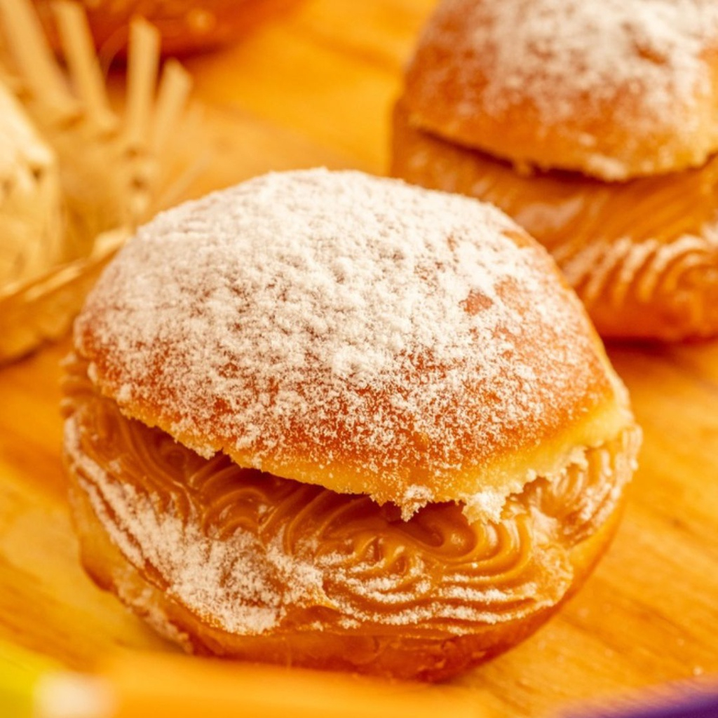 Sonho de doce de leite com açúcar gelado polvilhado