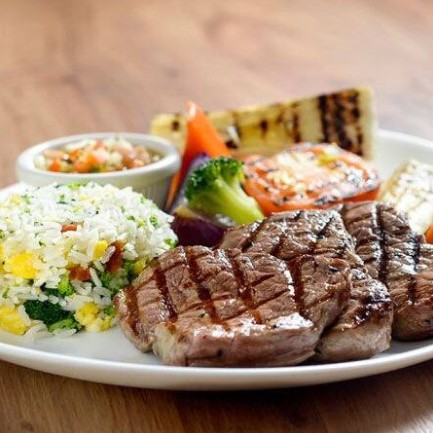 Steak de 160g de Picanha, arroz, feijão, legumes saltê, farofa e molho especial da casa