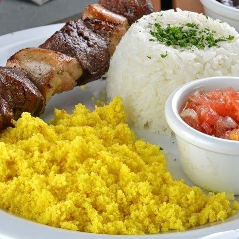 Arroz 160g, feijão 160g, legumes Saltê 140g, farofa, molho especial da casa e 2 espetos a escolher