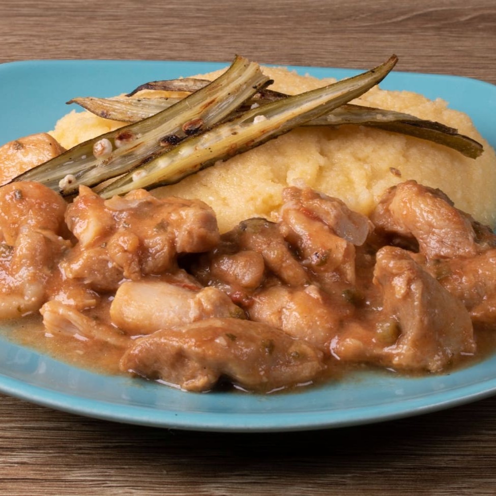 Produto congelado pronto para aquecer. Esta marmita é leve de sal e feita com ingredientes orgânicos. Sem adição de conservantes. Ingredientes: polenta (água, farinha de milho* enriquecida com ferro e ácido fólico, cebola*, azeite de oliva extra virgem, sal e alho*), frango em molho (água, sobrecoxa de frango*, tomate*, cebola*, talos de beterraba*, azeite de oliva extravirgem, salsinha*, sal, alho*, colorau e páprica doce), quiabo*, limão*, azeite oliva extra virgem e sal. * Ingredientes preferencialmente orgânicos Contém Glúten. Alérgicos Pode Conter: ovo, trigo, aveia, leite, soja e castanhas. Serve 1 pessoa. Aquecimento em microondas. Todo modo de preparo está descrito na embalagem. Não acompanha prato e talher.