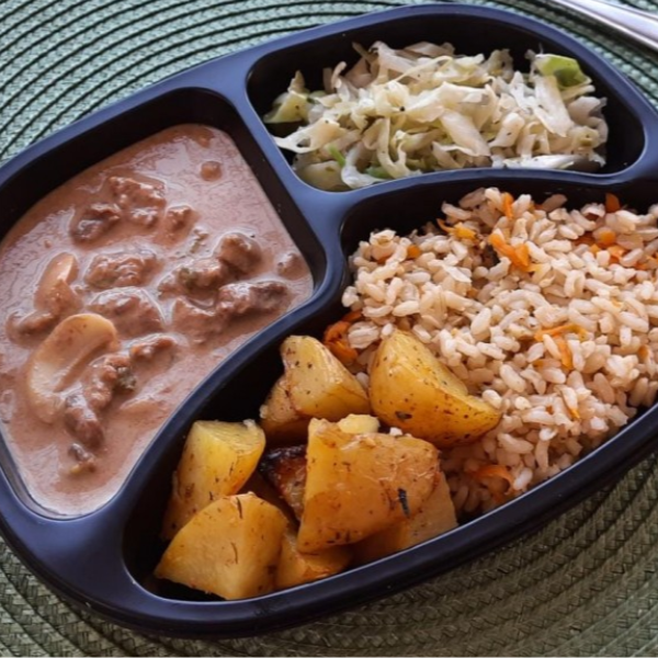 Produto congelado pronto para aquecer. Feito com ingredientes selecionados e sem adição de conservantes. Opção perfeita para quem busca praticidade sem abrir mão da qualidade e sabor. Ingredientes: Patinho em cubos, arroz integ, batata, repolho, champignon, cenoura, alho, creme de leite, catchup, mostarda, cheiro verde e sal. Alérgicos: Contém derivados de leite. Pode conter traços de soja, trigo e ovo. Contém Glúten por ser manipulado onde se usa glúten. Serve 1 pessoa. Aquecimento em microondas. Todo modo de preparo está descrito na embalagem. Não acompanha prato e talher.