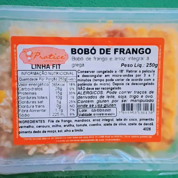 Produto Congelado Pronto Para Aquecer. Feito com ingredientes selecionados e sem adição de conservantes. Opção perfeita para quem busca praticidade sem abrir mão da qualidade e sabor. Ingredientes: Filé de frango, mandioca, arroz integral, leite de coco, pimentão vermelho, cenoura, milho, ervilha, tomate, coentro, azeite de oliva, azeite de dende, pimenta dedo de moça, sal, alho e limão. Alérgicos: Pode conter traços de derivados de leite, soja, trigo e ovo. Contém Glúten por ser manipulado onde se usa glúten. Serve 1 pessoa. Aquecimento em microondas. Todo modo de preparo está descrito na embalagem. Não acompanha prato e talher.