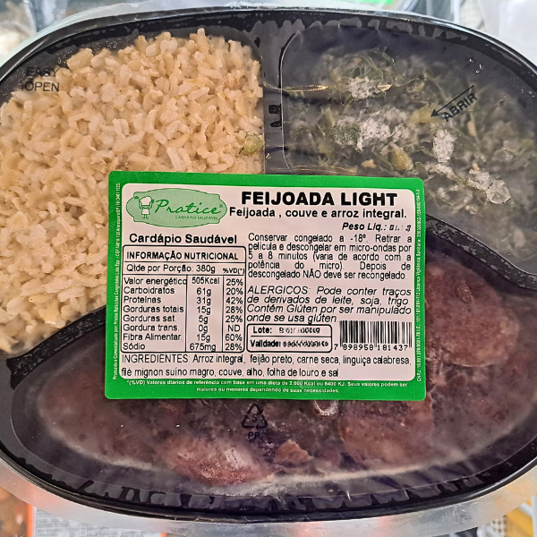 Produto congelado pronto para aquecer. Feito com ingredientes selecionados e sem adição de conservantes. Opção perfeita para quem busca praticidade sem abrir mão da qualidade e sabor. Ingredientes: Arroz integral, feijão preto, carne seca, linguiça calabresa, filé mignon suíno magro, couve, alho, folha de louro e sal. Alérgicos: Pode conter traços de derivados de leite, soja, trigo. Contém Glúten por ser manipulado onde se usa glúten. Serve 1 pessoa. Aquecimento em microondas. Todo modo de preparo está descrito na embalagem. Não acompanha prato e talher.