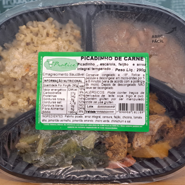 Produto congelado pronto para aquecer. Feito com ingredientes selecionados e sem adição de conservantes. Opção perfeita para quem busca praticidade sem abrir mão da qualidade e sabor. Ingredientes: Patinho picado, arroz integral, cenoura, feijão, chicória, tomate, alho, pimentão vermelho, pimentão amarelo, cheiro verde, chimichurri e sal. Alérgicos: Pode conter traços de derivados de leite, soja, trigo e ovo. Contém glúten por ser manipulado onde se usa glúten. Serve 1 pessoa. Aquecimento em microondas. Todo modo de preparo está descrito na embalagem. Não acompanha prato e talher.