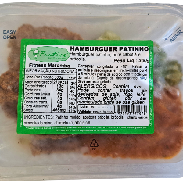 Produto congelado pronto para aquecer. Feito com ingredientes selecionados e sem adição de conservantes. Opção perfeita para quem busca praticidade sem abrir mão da qualidade e sabor. Ingredientes: Patinho moído, abóbora cabotiá, brócolis, alho, cheiro verde, chimichurri, pimenta do reino e sal. Alérgicos: Contém ovo. Pode conter traços de derivados de leite, soja, trigo. Contém Glúten por ser manipulado em ambiente onde se manipula glúten. Serve 1 pessoa. Aquecimento em microondas. Todo modo de preparo está descrito na embalagem. Não acompanha prato e talher.