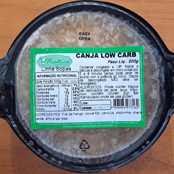 Produto congelado pronto para aquecer. Feito com ingredientes selecionados e sem adição de conservantes. Com o Empório Tartufo, é fácil e rápido ter uma refeição completa e saborosa em qualquer lugar. Ingredientes: batata, caldo frango natural, água, abobrinha, chuchu, cebola, cenoura, repolho, abóbora, fubá, alho, sal, óleo de soja e cheiro verde. Contém glúten. Alérgicos contém: derivados de soja. E pode conter trigo, ovos, leite e castanhas. Serve 1 pessoa. Aquecimento em microondas. Todo modo de preparo está descrito na embalagem. Não acompanha prato e talher.