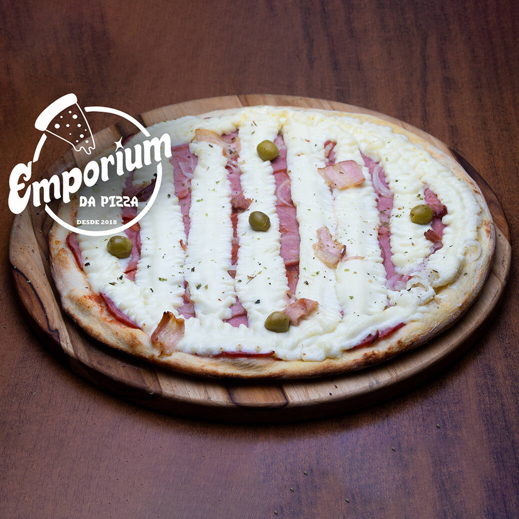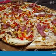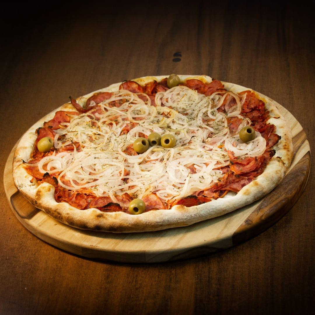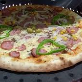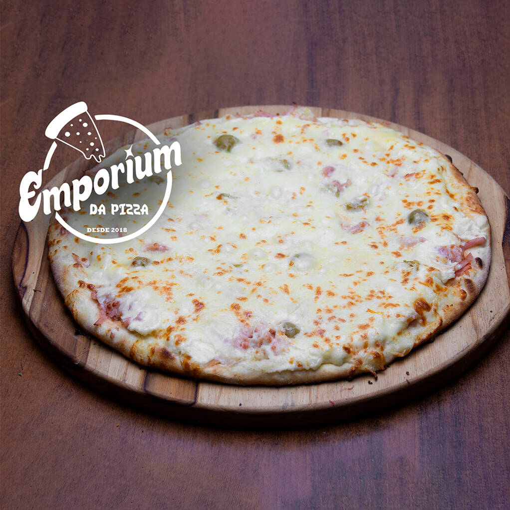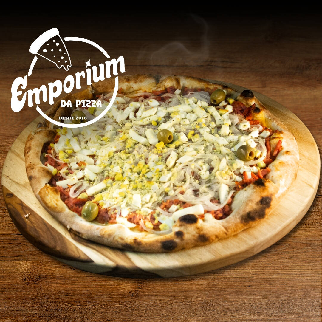 Pizza portuguesa, presunto, ervilha, milho, palmito,cebola,ovo , mussarela, orégano e azeitonas