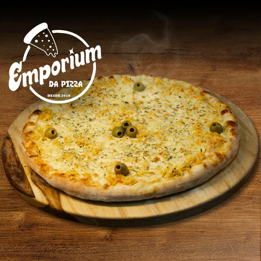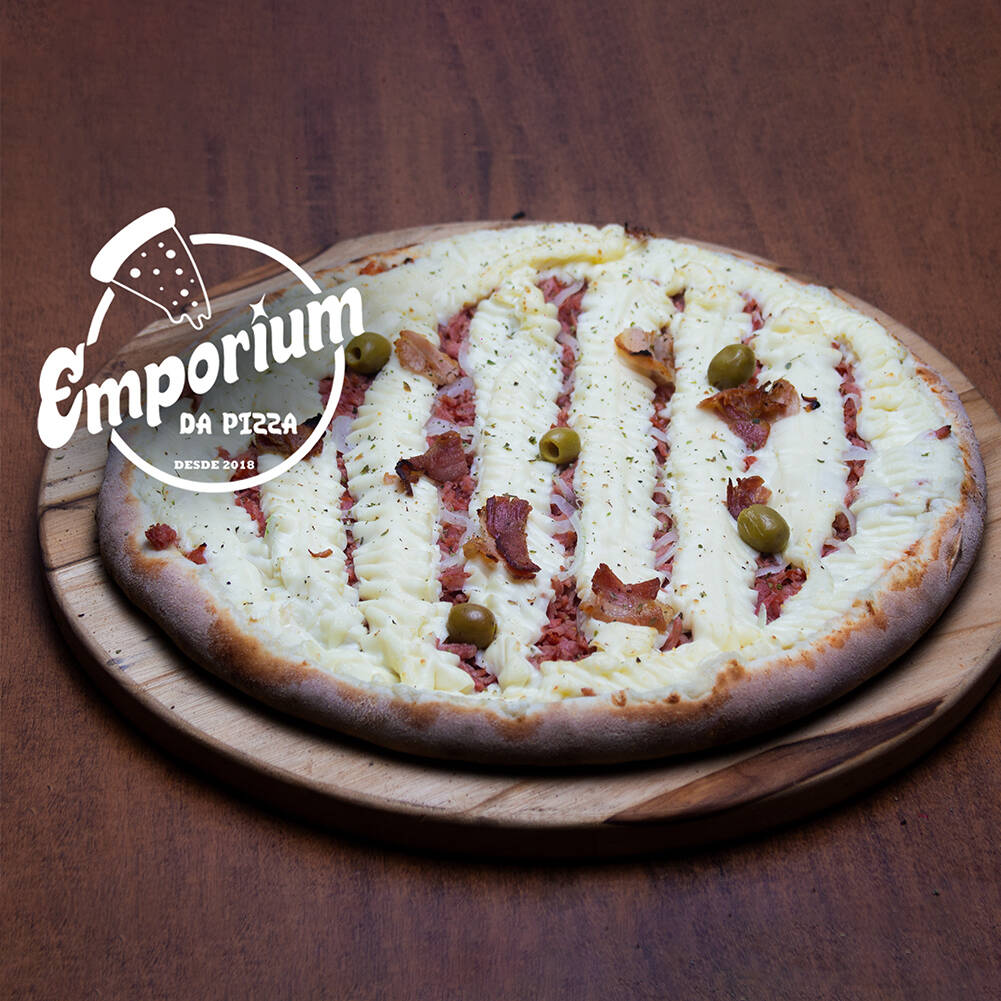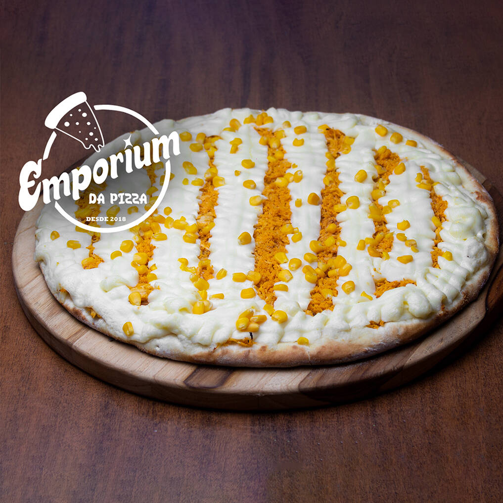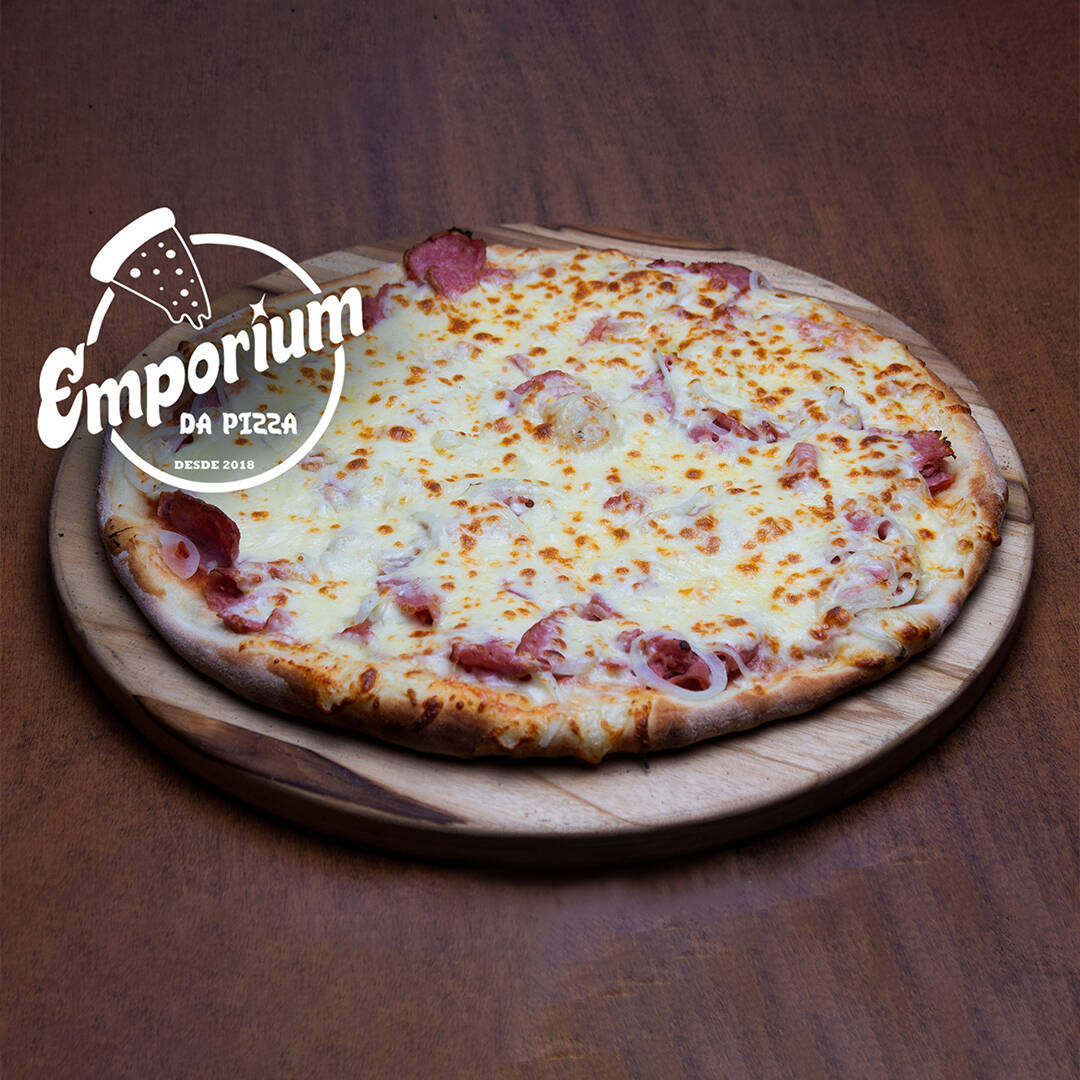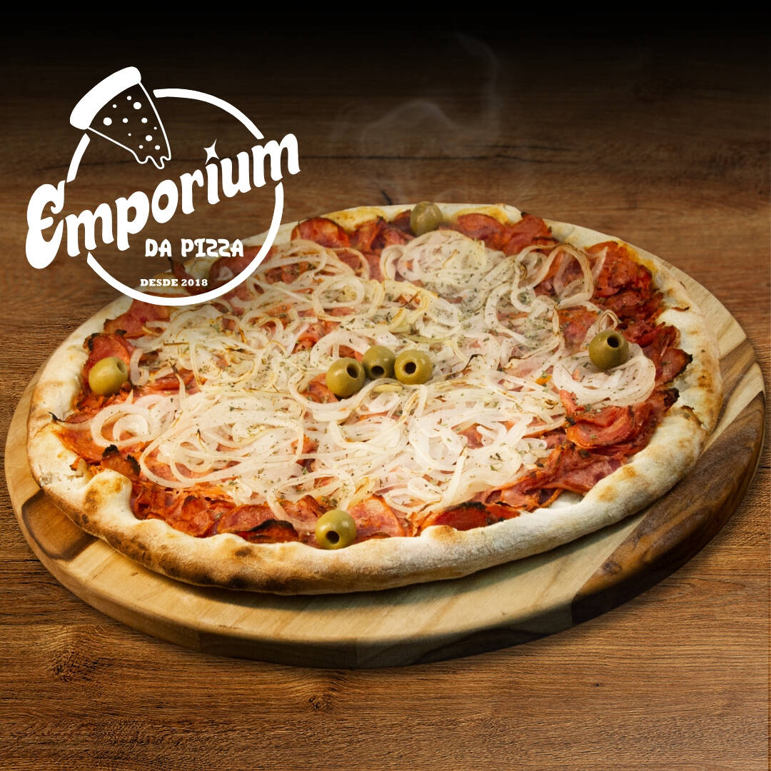 Pizza portuguesa, presunto, ervilha, milho, palmito,cebola,ovo , mussarela, orégano e azeitonas