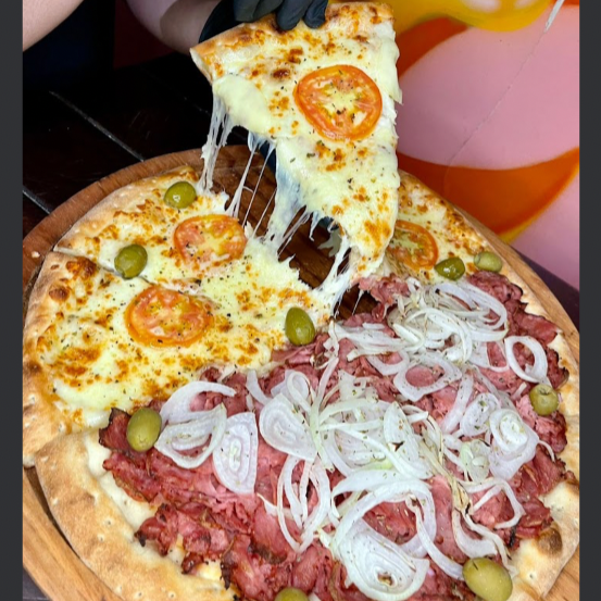 mussarela,carne bovina moida e temperada, pimentão,champignon e bacon