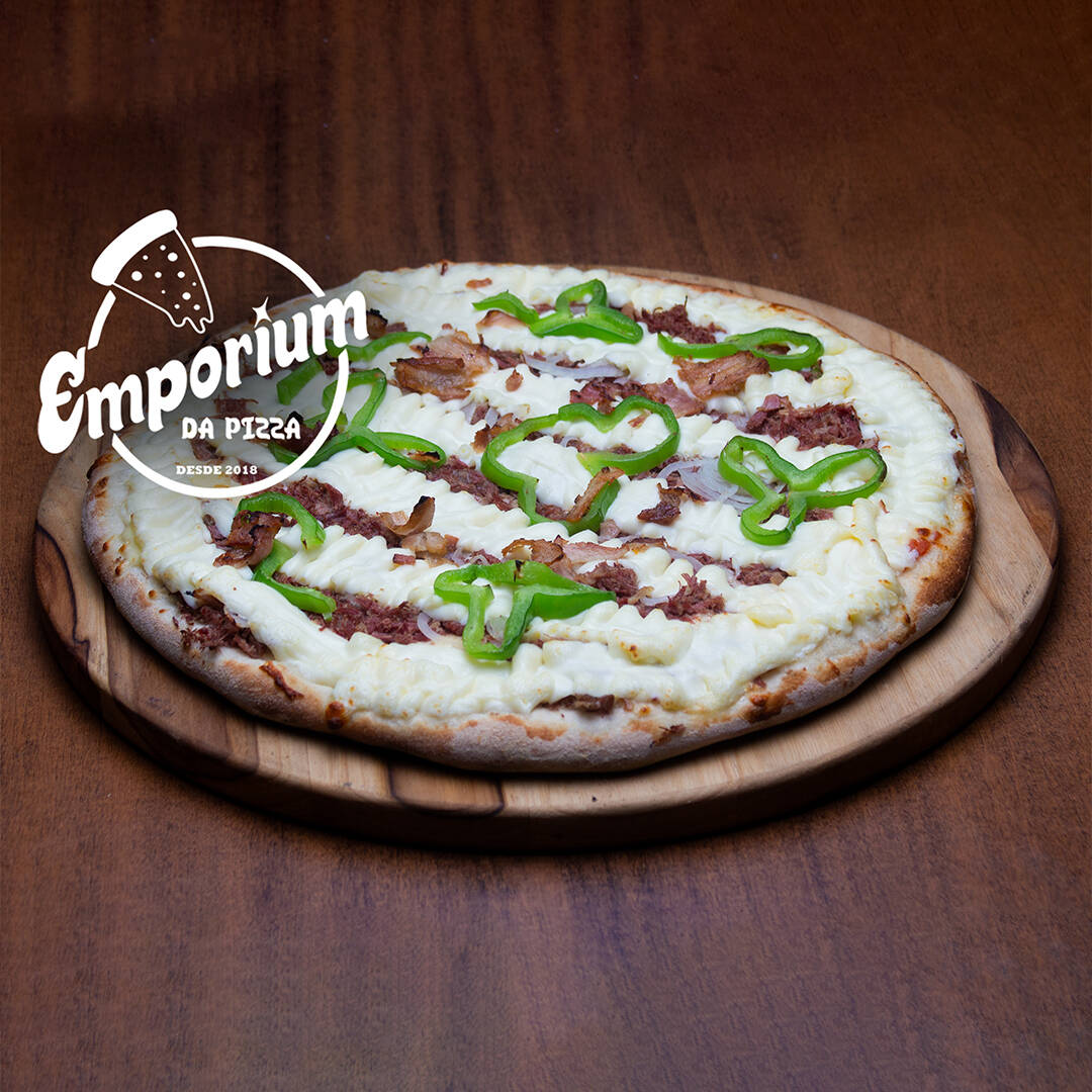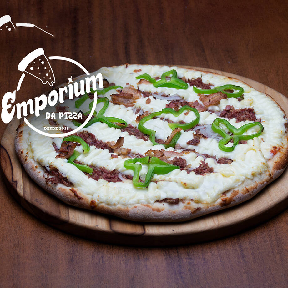 mussarela,carne seca desfiada refogada na manteiga,cebola,pimentão,catupiry e bacon