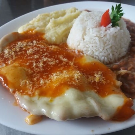 Servido com arroz, feijão, 2 ovos, salada e escolha sua guarnição: Fritas, purê ou legumes.