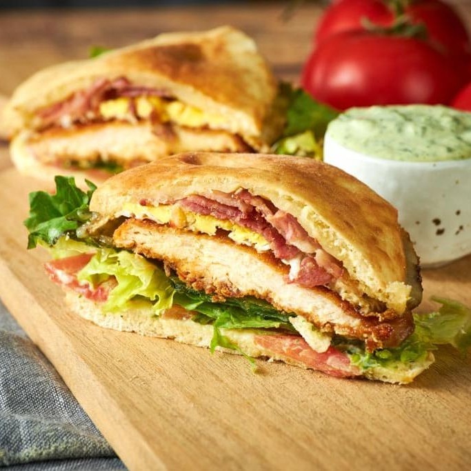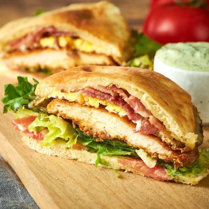 filé de frango empanado, bacon, ovo, catupiry, cheddar, alface, tomate e maionese da casa no pão sírio.