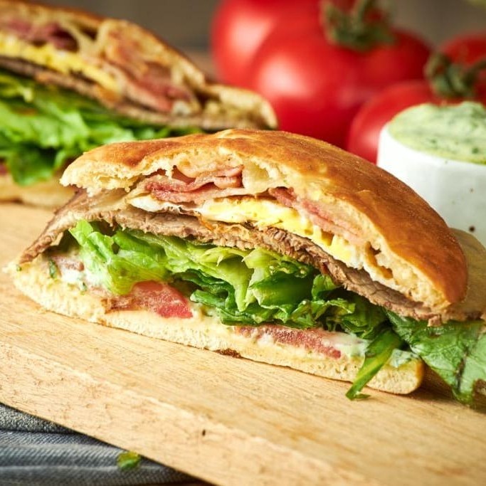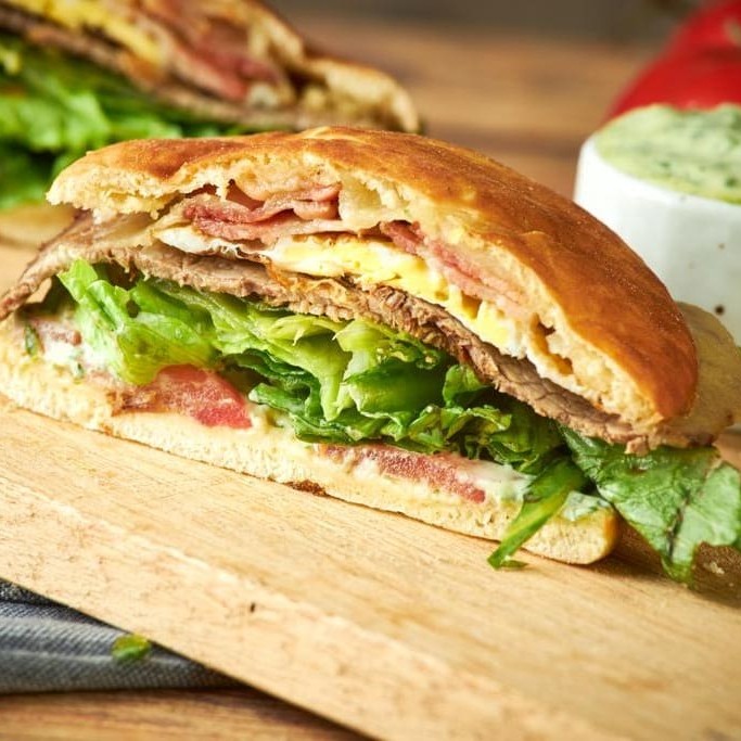 rosbife, bacon, ovo, catupiry, cheddar, alface, tomate e maionese da casa no pão sírio.