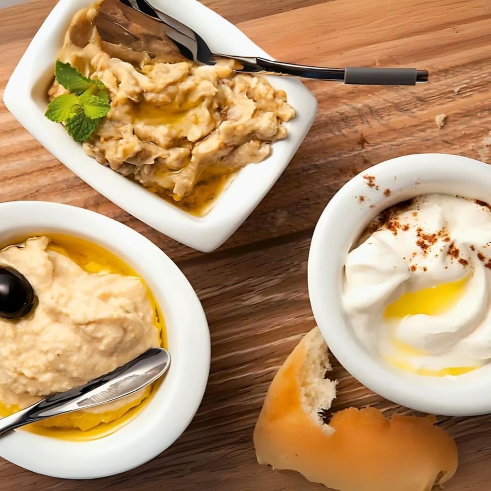 Combo com três clássicos da culinária árabe: 100g de coalhada seca artesanal, 100g de homus (grão-de-bico com tahine) e 100g de babaganush (berinjela defumada). Perfeito para acompanhar pão sírio, kibe cru ou qualquer prato da casa. Leves, saudáveis e cheios de personalidade!