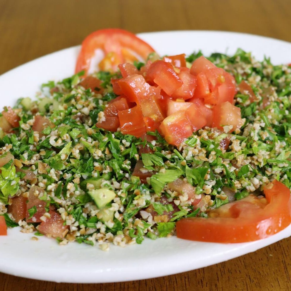 Salada tradicional da culinária árabe feita com trigo para kibe hidratado, tomate, pepino, salsinha, hortelã fresca, cebola e suco de limão. Temperado com azeite extra virgem e um toque de sal, o tabule é leve, refrescante e nutritivo — ideal para acompanhar pratos ou ser saboreado sozinho como uma refeição saudável, equilibrada e cheia de sabor natural.