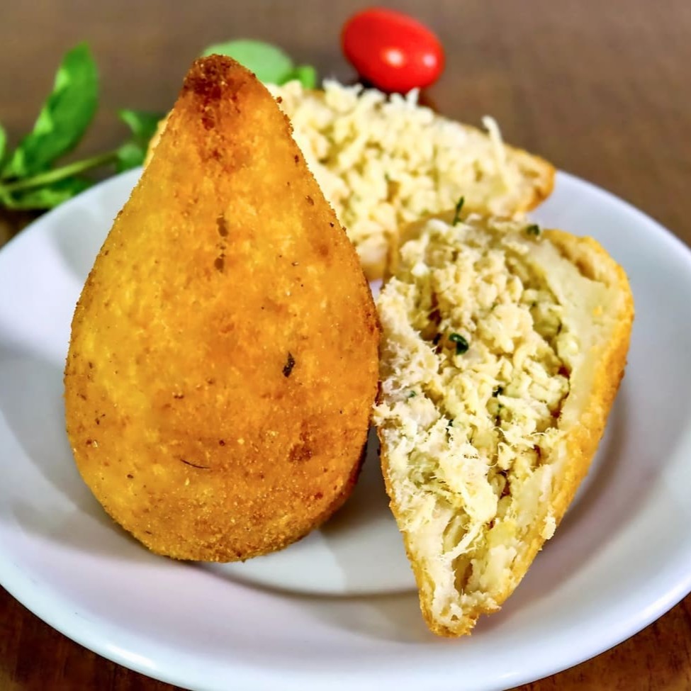 Coxinha com massa macia por fora e recheio suculento de frango desfiado, temperado no capricho com ervas e especiarias. Frita até ficar dourada e crocante, essa delícia é perfeita pra matar a fome ou acompanhar aquele combo com kibe e esfiha. Crocância, sabor e nostalgia em cada mordida!