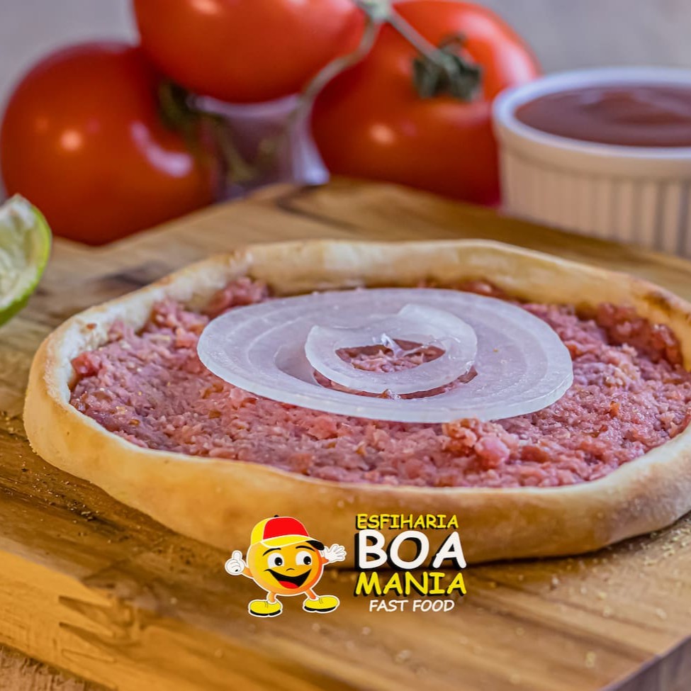 Esfiha de calabresa (aurora) moída e com fatias de cebola.