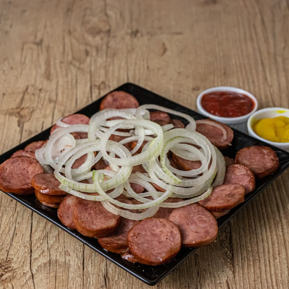 Calabresa cortada em tiras frita no azeite e acebolada, 800g