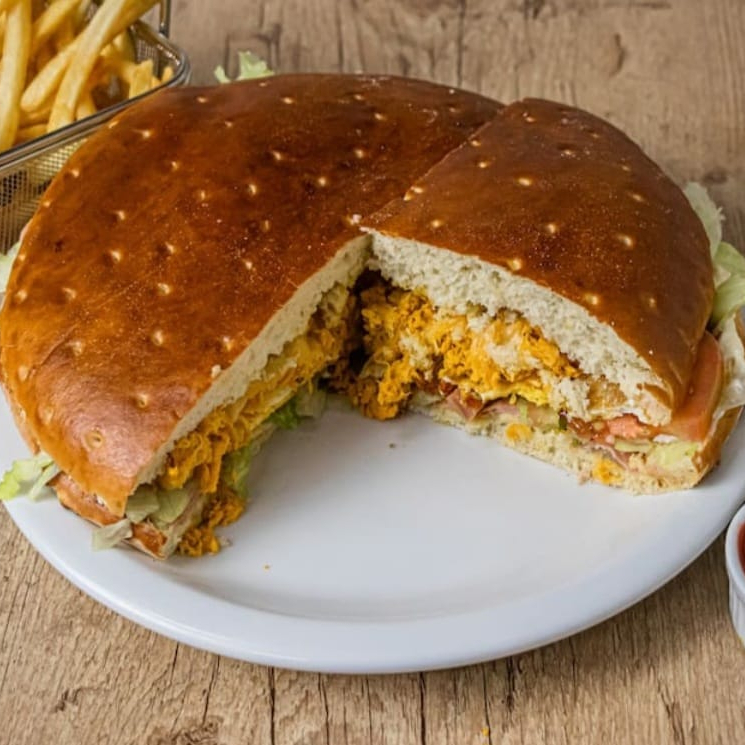Acompanha: Hambúrguer, presunto, salada, maionese e ovo.