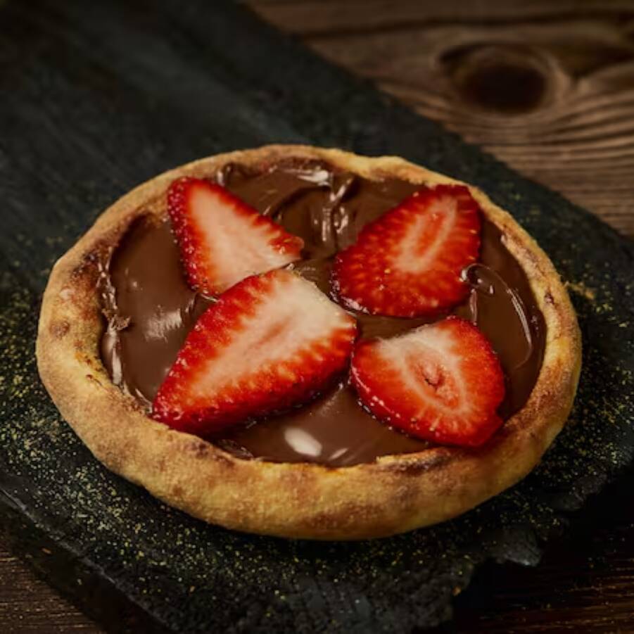 Uma deliciosa opção de sabor para quem gosta de uma boa esfiha doce de chocolate preto ao leite com morango bem saborosa.