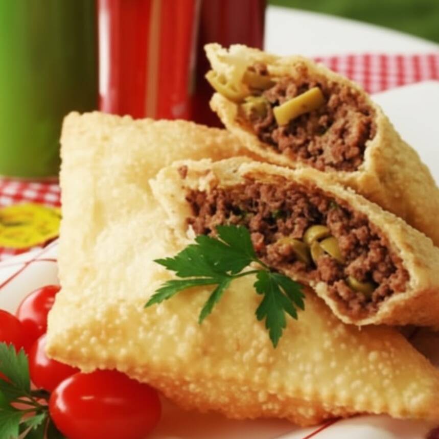 Um crocante e saboroso pastel recheado de carne.