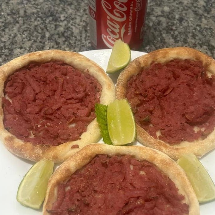 Esfiha aberta com carne moída bem temperada, servida no ponto certo de assado, ideal para um lanche rápido.