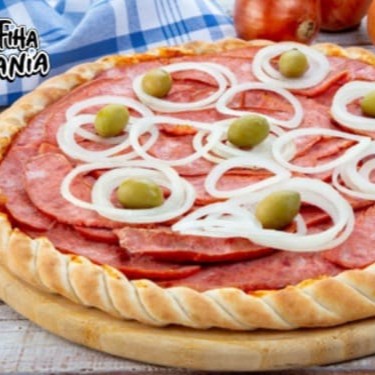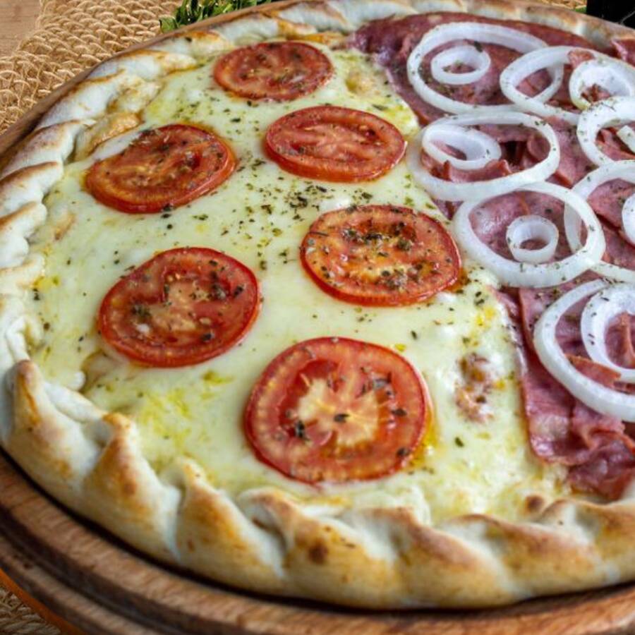 Massa tradicional ,molho de tomate recheada com Calabresa fatiada e cebola fatiada , finalizada com azeitona e orégano.