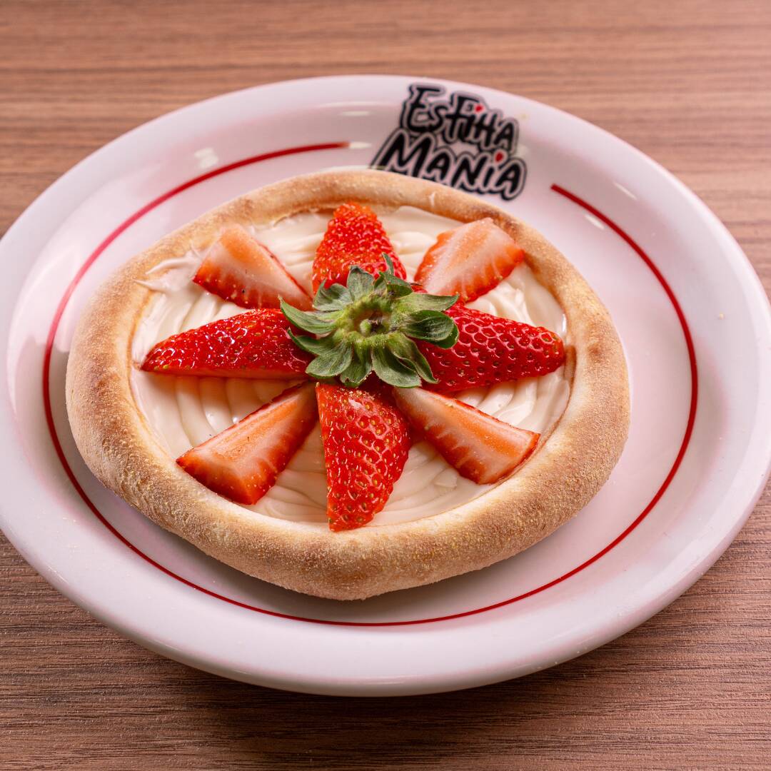 Uma explosão de sabor em cada mordida! Nossa esfiha de chocolate branco com morango combina a cremosidade do chocolate com a leveza dos morangos.