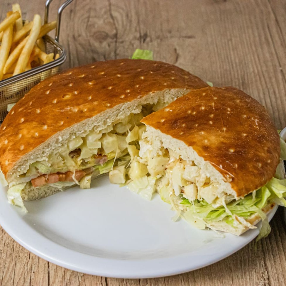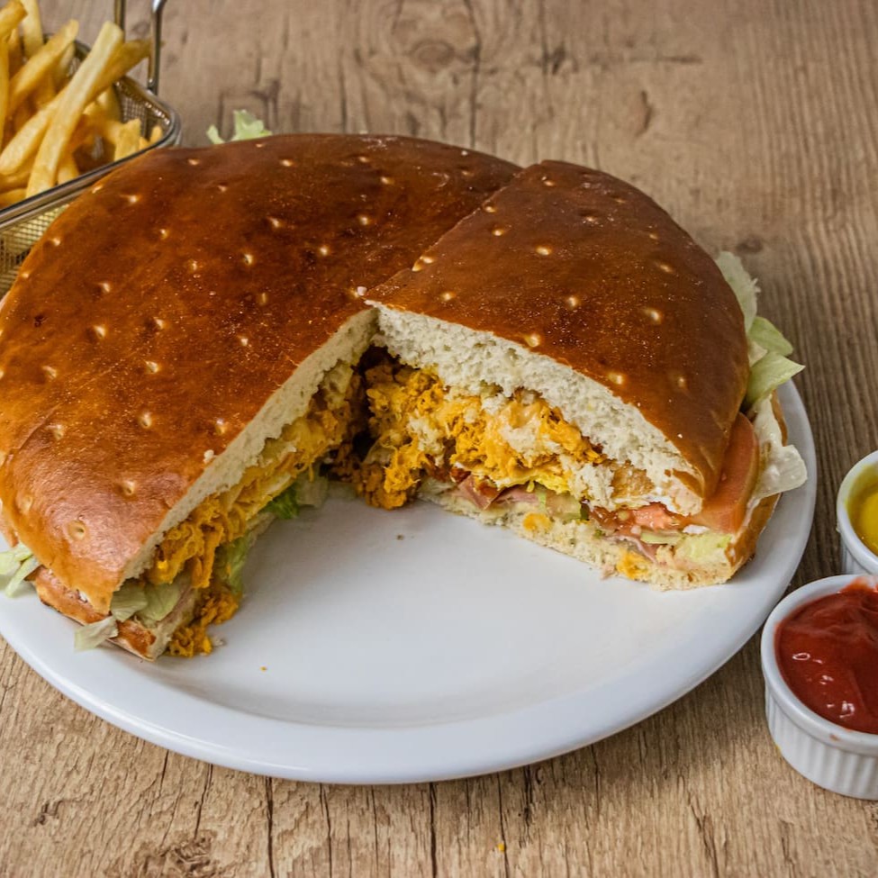 Acompanha pão do chef, hamburguer, presunto, queijo prato, ovo, bacon,alface, tomate e maionese + acrescimo de batata frita