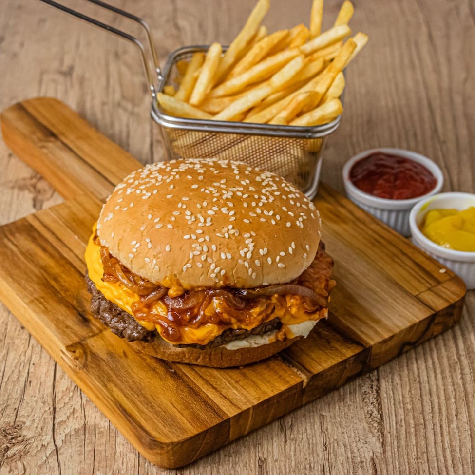 Pão de brioche, 2 hamburguers artesanais de fraldinha 150g cada, cheddar alemão Original, cebola frita no azeite e barbecue + Batata Gratis