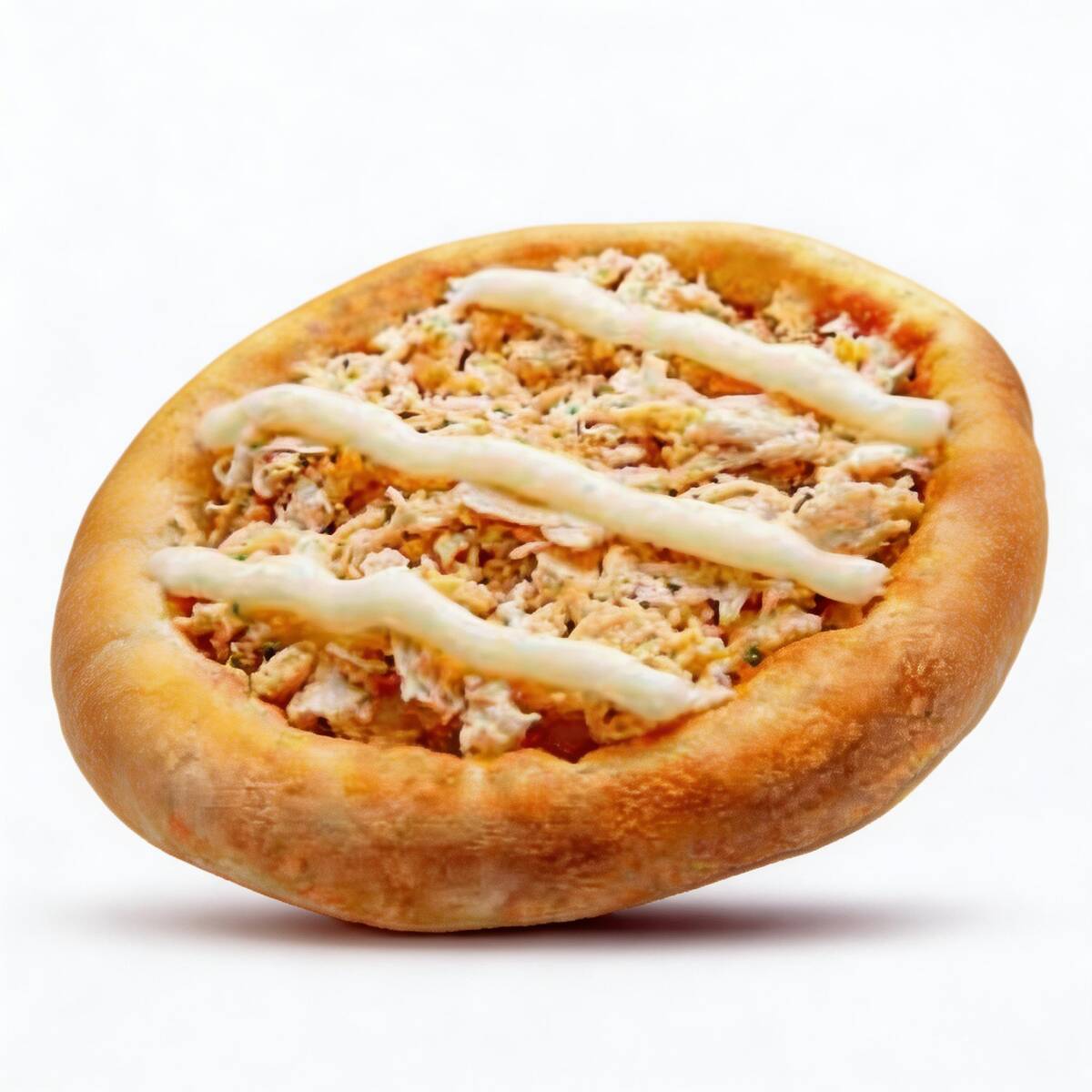 Mini pizza frango com requeijão tipo Catupiry de primeira qualidade (sem amido), molho de tomate e Azeitona